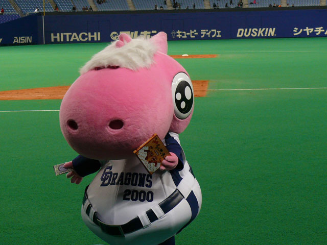 お仕事お休みにしてナゴドへ行ってきました。時間ギリギリまでお仕事していたりあちゃんと観てました。 アタシひとり沖縄の話をべらべらしゃべりながら試合見てました。 西川・岩崎達の二遊間になんか数年後の淡い期待を抱けたよ。今年はナゴ球で2人を固定して試合に出し続けてほしい。 あと沖縄でも思ったけれど藤井くんがんばってるね。足速い選手は見ていて楽しい。 ロッテの西岡選手のHRがなんか凄かった。ライナーHR。 試合はフォアボールいっぱいでしまりがなかったけどねー・・・。まだこれからかねー。 沖縄土産いただき。 続きはドアライダーにのるドアラさん。