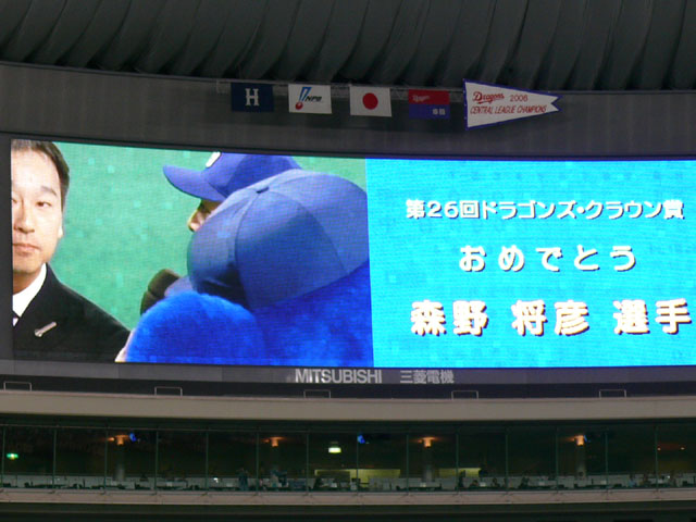 朝倉投手人身事故って、ちょっとおいっ。 それは、どあほうと言ってしまうよ・・・。 ドアラ、かぶってるかぶってる! 10/4 クラウン賞受賞。インタビューの内容とかは別のサイトさんで補ってください(ぉぃ