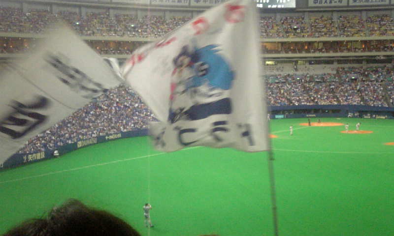 ナゴド観戦記録20勝16敗。最近○●○●・・と続いてきたのがここで連勝きましたか。20勝到達。 今日は急遽だったんですがつよみさんから余っているチケットを購入。 外野応援席ど真ん中。何気にこんなところは今季初。(携帯撮影 さすがにそんな席だと応援に専念したくなるので、今日はカメラは持って行きませんでした。 立浪さん1000打点達成の時点ではちょっと後悔したけど・・・ なので以下画像は一切ありません。 ただの浮かれドラファンの文章レポです。